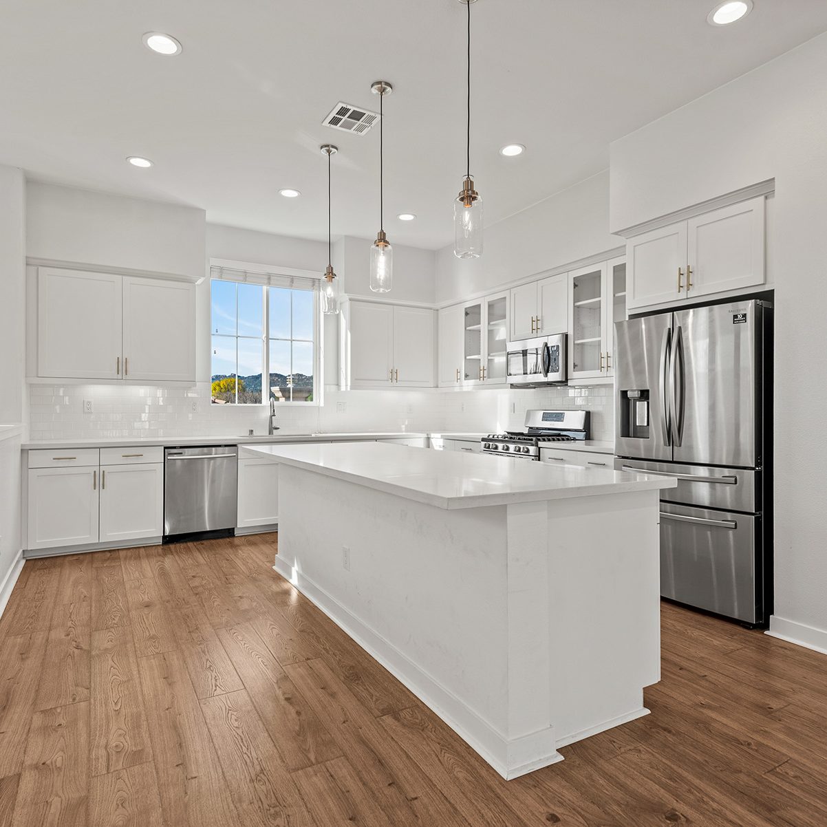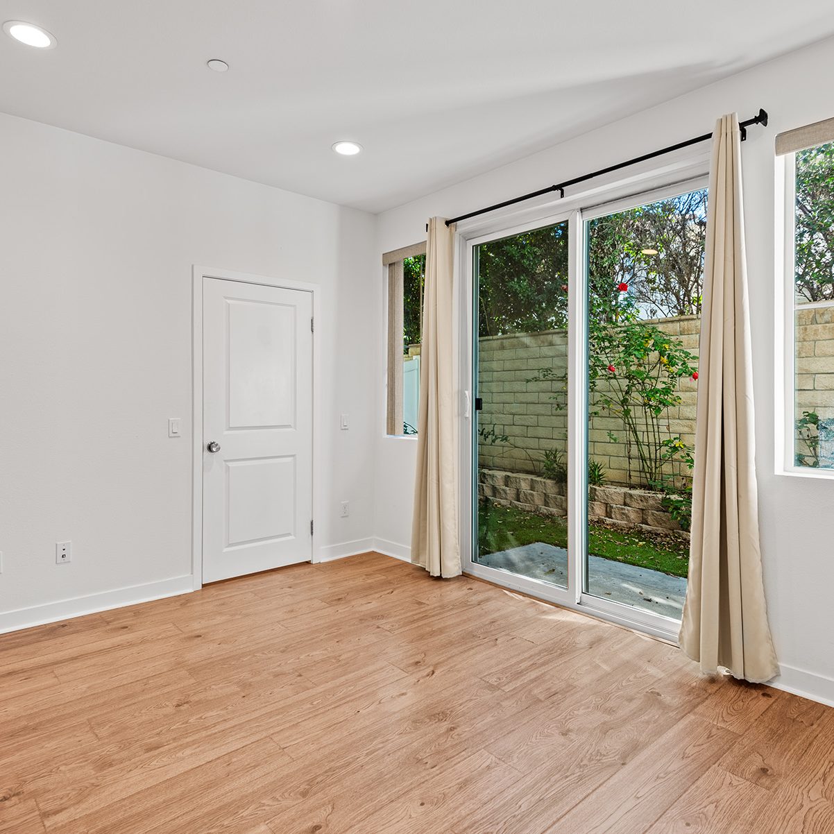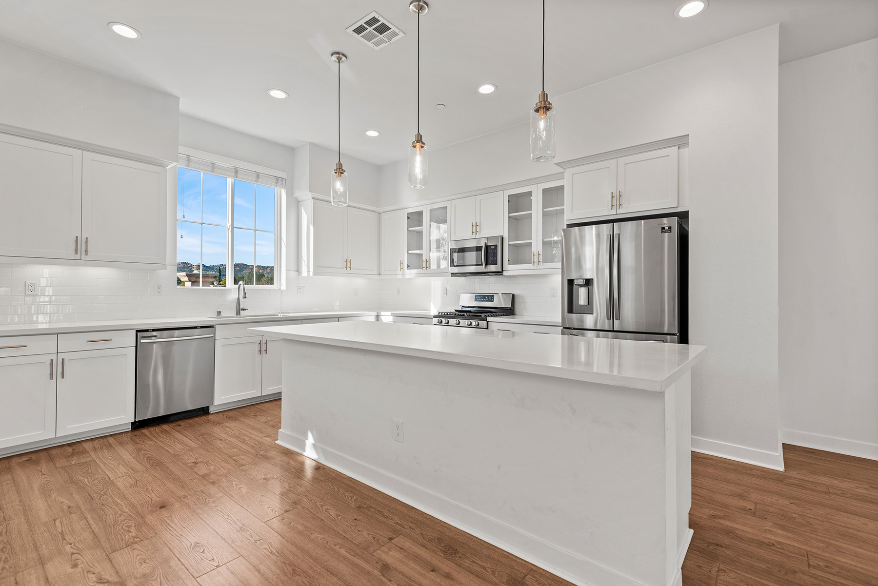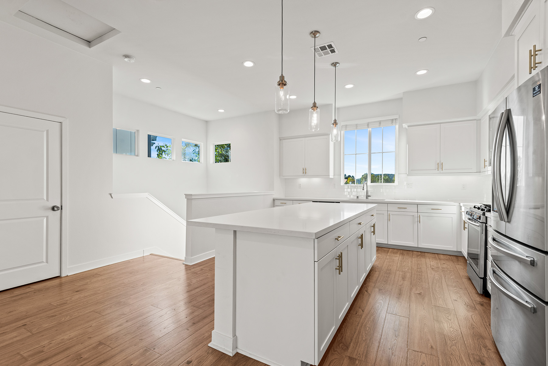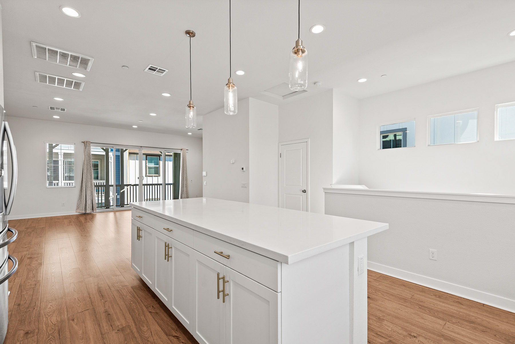 The main entry, via a private walkway, features high ceilings and natural light. The entry-level 4th bedroom suite offers privacy with an en-suite bath, walk-in closet, and side-yard access—ideal for guests, an office, or a gym. The second level houses the primary retreat with a dual-vanity en-suite and walk-in closet, two additional well-sized bedrooms served by a full dual-vanity bath with a soaking tub, and a separate laundry room with plenty of storage. The third floor is an open-concept living space with a gourmet kitchen and it features solid wood cabinets, stainless steel appliances, Quartz countertops, and a large island. Additionally a walk-in pantry, dining area, powder room, and spacious living room complete the modern floor plan. Sliding glass doors open the living room to a large, private covered patio, perfect for relaxing or BBQs. Additional features include: direct-entry 2-car garage, central air/heat, dual pane windows, paid-off solar panels, tankless water heater, and ceiling fans.
