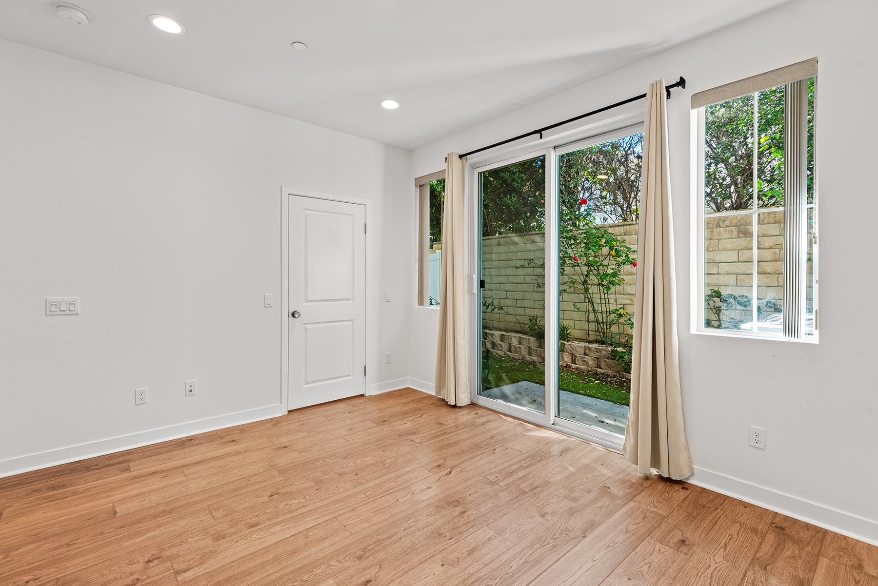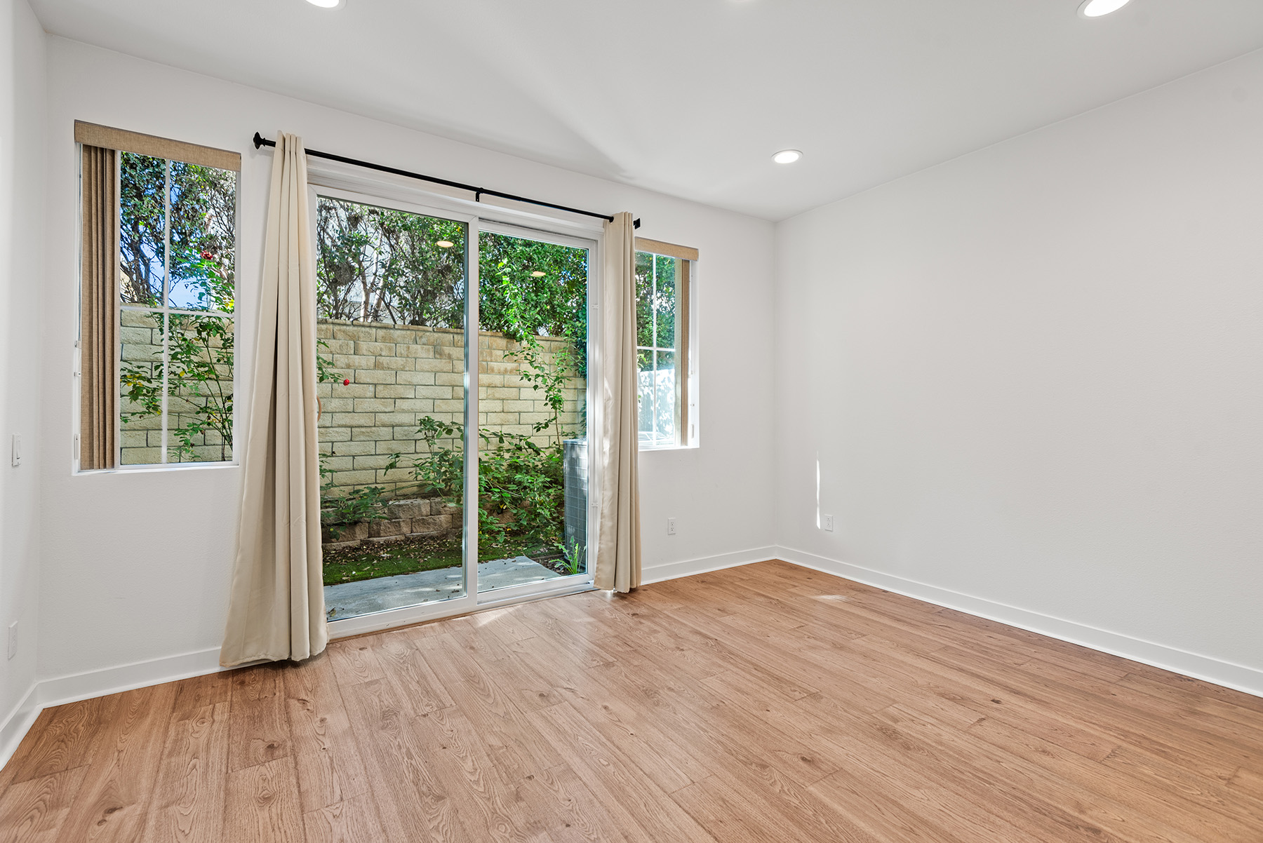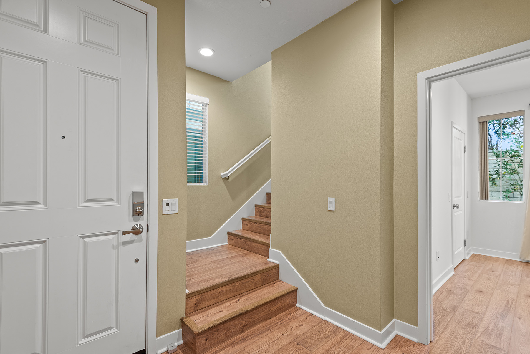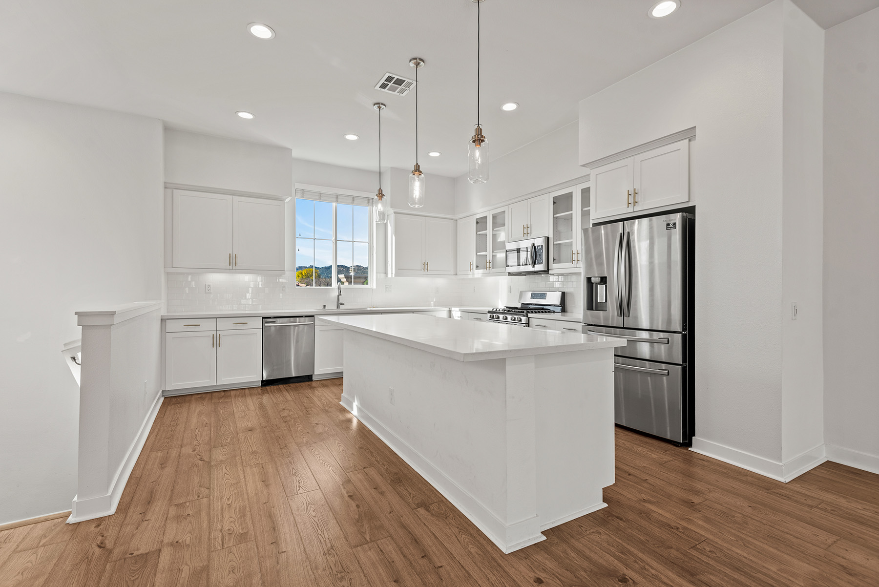 The main entry, via a private walkway, features high ceilings and natural light. The entry-level 4th bedroom suite offers privacy with an en-suite bath, walk-in closet, and side-yard access—ideal for guests, an office, or a gym. The second level houses the primary retreat with a dual-vanity en-suite and walk-in closet, two additional well-sized bedrooms served by a full dual-vanity bath with a soaking tub, and a separate laundry room with plenty of storage. The third floor is an open-concept living space with a gourmet kitchen and it features solid wood cabinets, stainless steel appliances, Quartz countertops, and a large island. Additionally a walk-in pantry, dining area, powder room, and spacious living room complete the modern floor plan. Sliding glass doors open the living room to a large, private covered patio, perfect for relaxing or BBQs. Additional features include: direct-entry 2-car garage, central air/heat, dual pane windows, paid-off solar panels, tankless water heater, and ceiling fans.