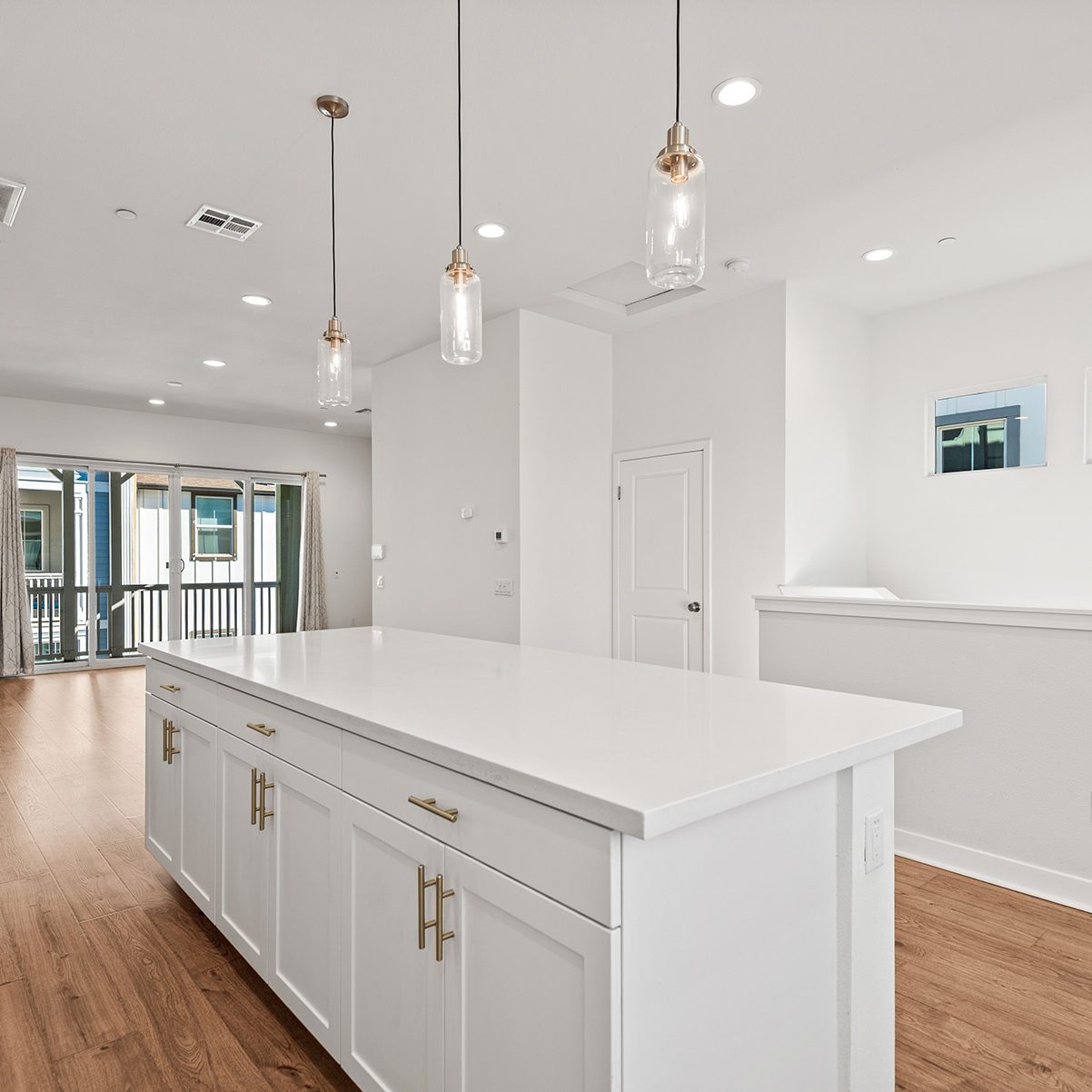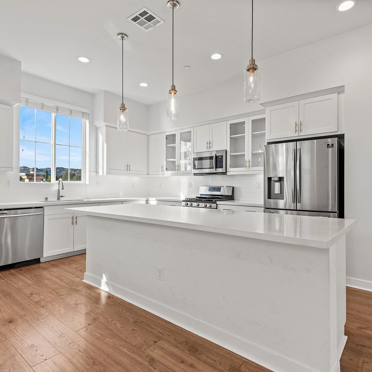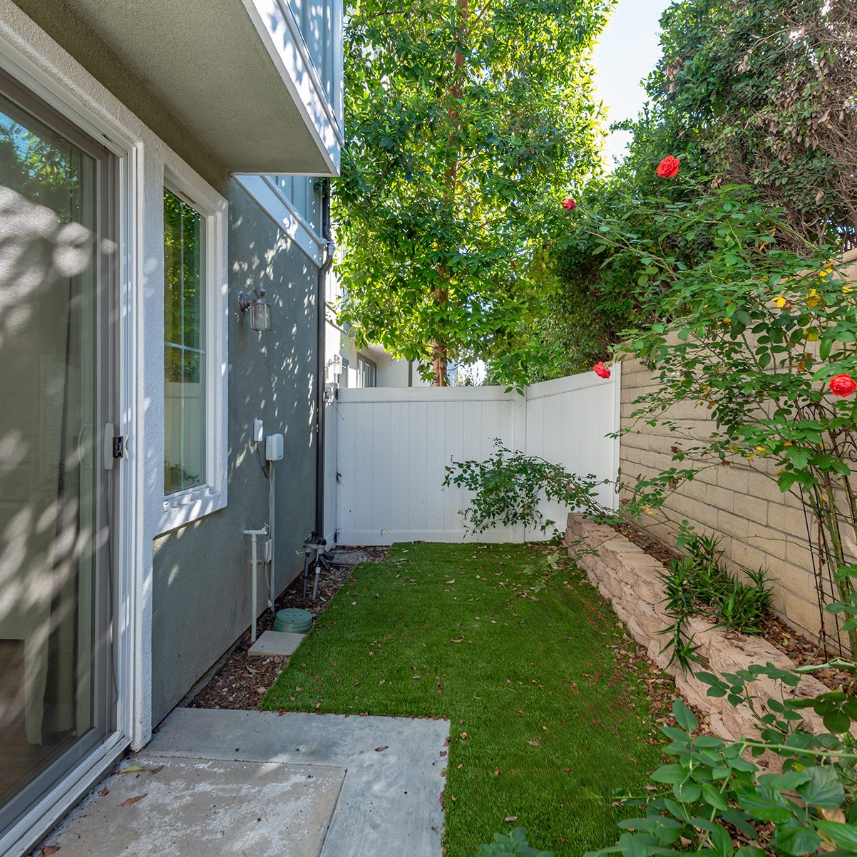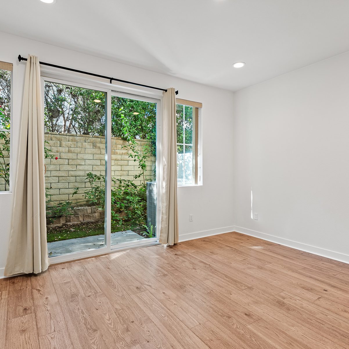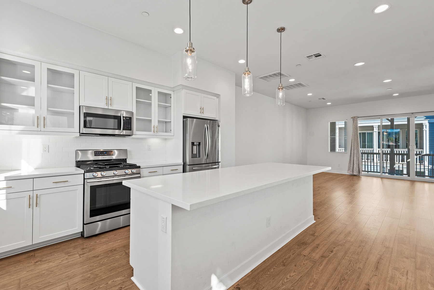The main entry, via a private walkway, features high ceilings and natural light. The entry-level 4th bedroom suite offers privacy with an en-suite bath, walk-in closet, and side-yard access—ideal for guests, an office, or a gym. The second level houses the primary retreat with a dual-vanity en-suite and walk-in closet, two additional well-sized bedrooms served by a full dual-vanity bath with a soaking tub, and a separate laundry room with plenty of storage. The third floor is an open-concept living space with a gourmet kitchen and it features solid wood cabinets, stainless steel appliances, Quartz countertops, and a large island. Additionally a walk-in pantry, dining area, powder room, and spacious living room complete the modern floor plan. Sliding glass doors open the living room to a large, private covered patio, perfect for relaxing or BBQs. Additional features include: direct-entry 2-car garage, central air/heat, dual pane windows, paid-off solar panels, tankless water heater, and ceiling fans.