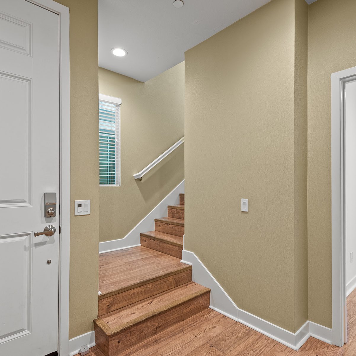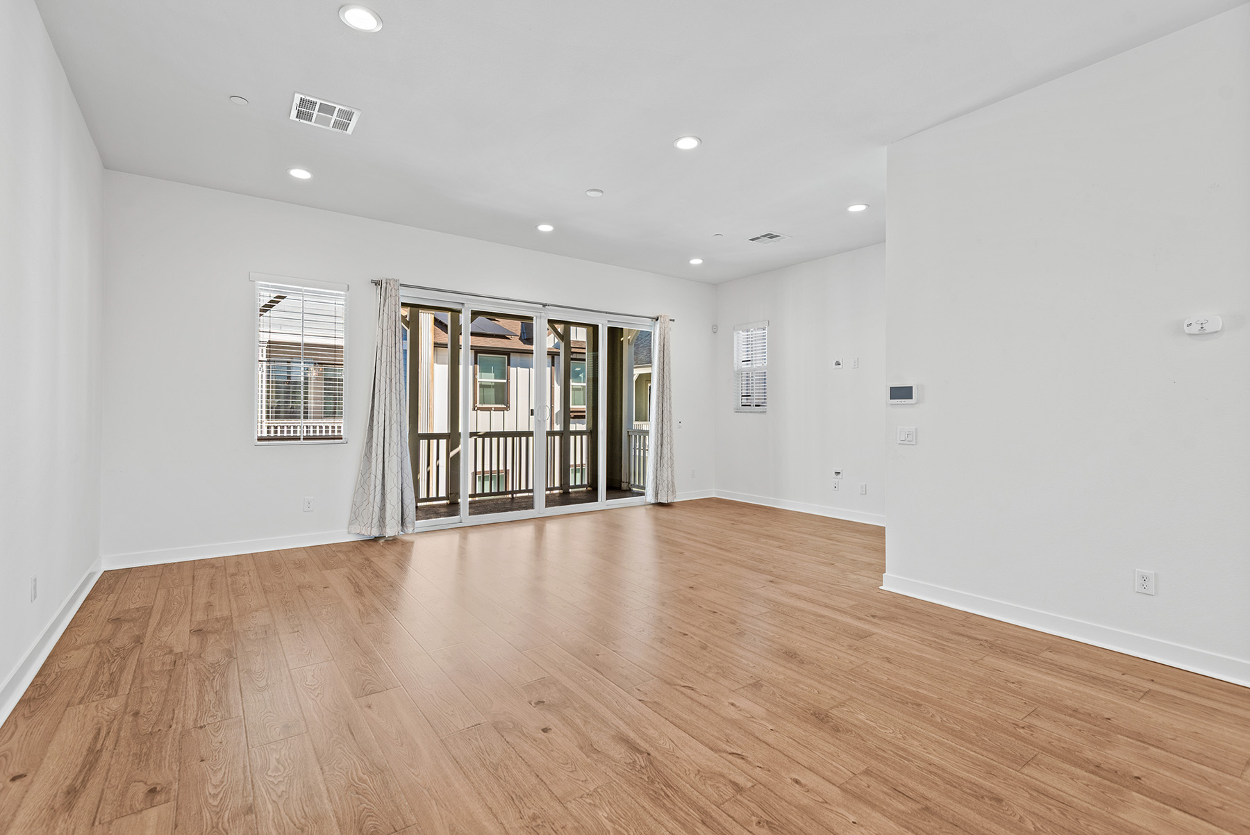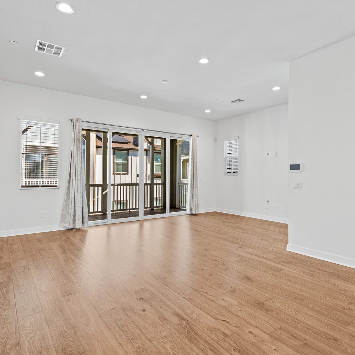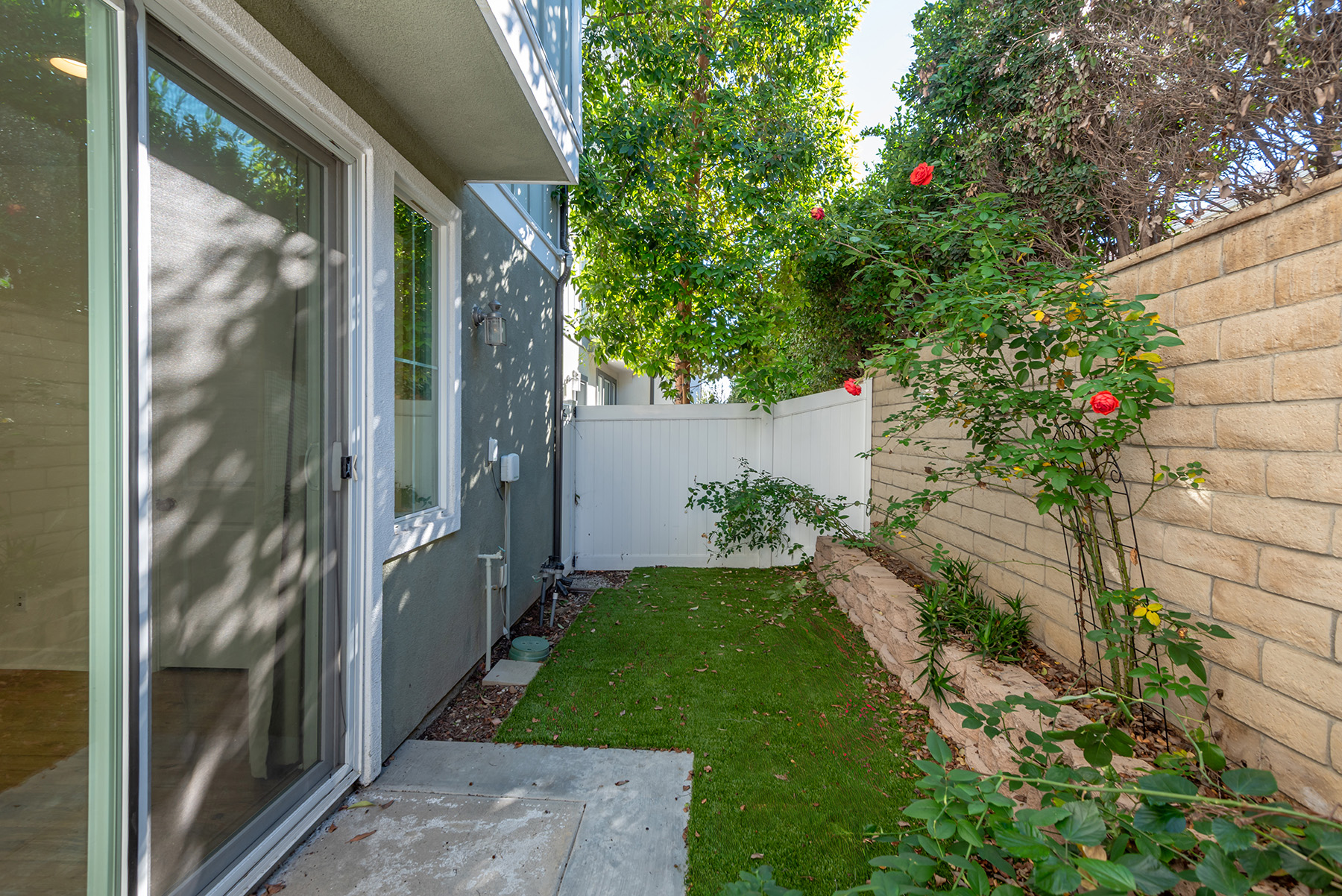 The main entry, via a private walkway, features high ceilings and natural light. The entry-level 4th bedroom suite offers privacy with an en-suite bath, walk-in closet, and side-yard access—ideal for guests, an office, or a gym. The second level houses the primary retreat with a dual-vanity en-suite and walk-in closet, two additional well-sized bedrooms served by a full dual-vanity bath with a soaking tub, and a separate laundry room with plenty of storage. The third floor is an open-concept living space with a gourmet kitchen and it features solid wood cabinets, stainless steel appliances, Quartz countertops, and a large island. Additionally a walk-in pantry, dining area, powder room, and spacious living room complete the modern floor plan. Sliding glass doors open the living room to a large, private covered patio, perfect for relaxing or BBQs. Additional features include: direct-entry 2-car garage, central air/heat, dual pane windows, paid-off solar panels, tankless water heater, and ceiling fans.