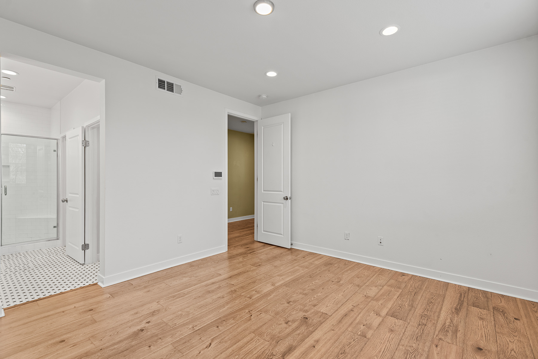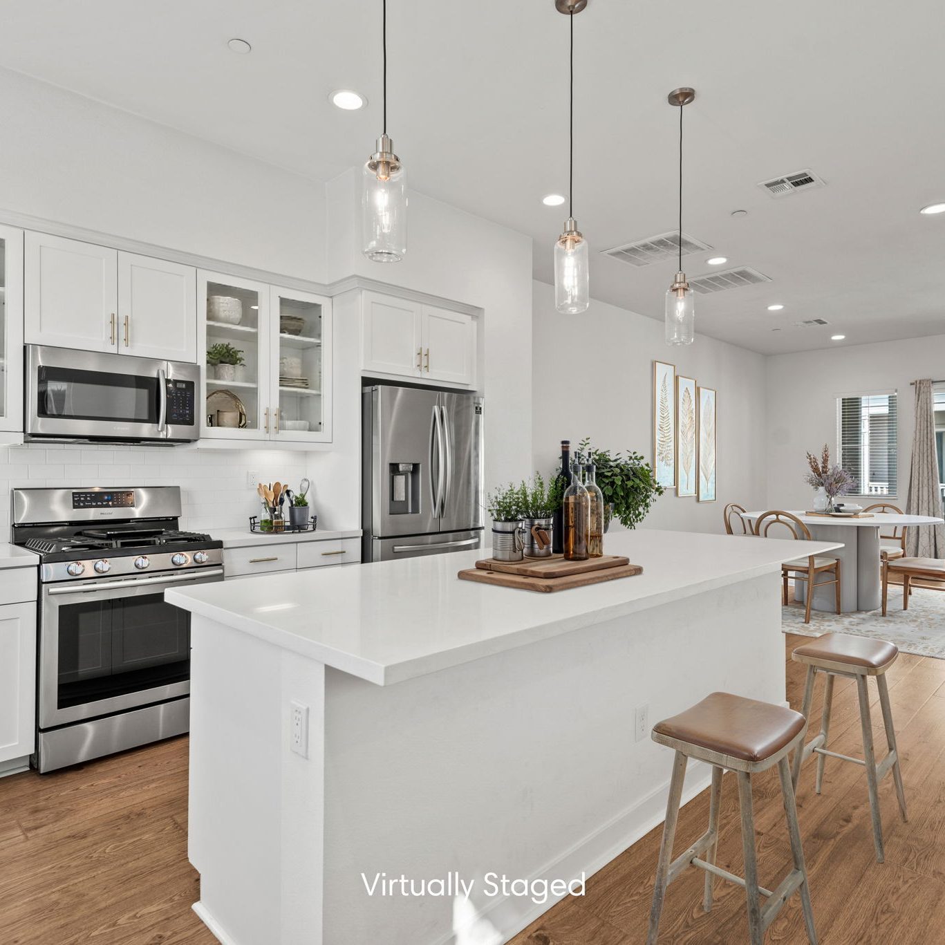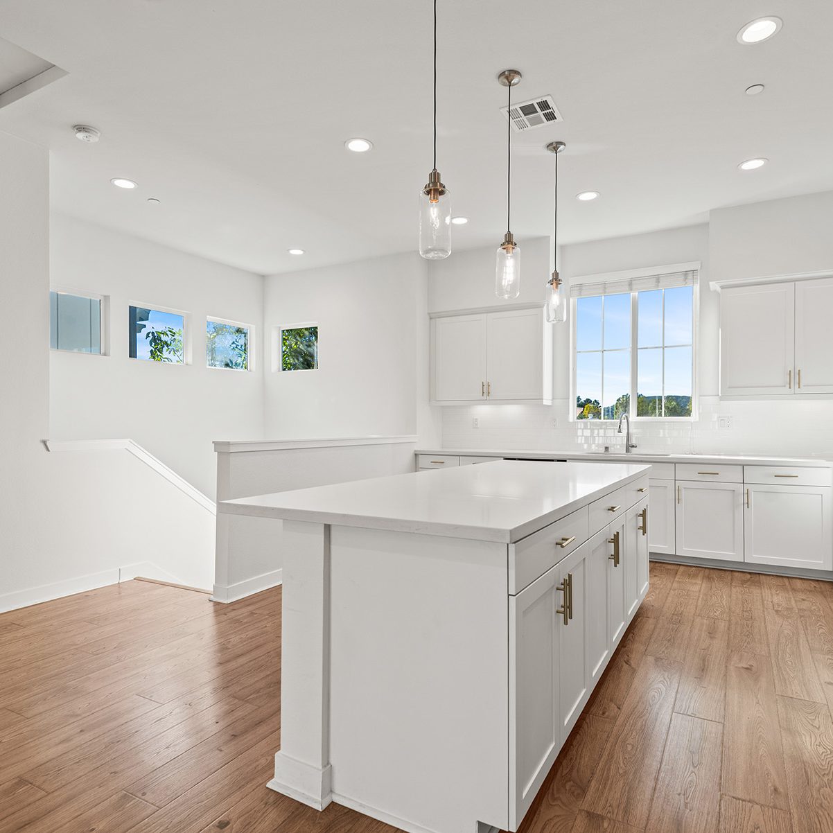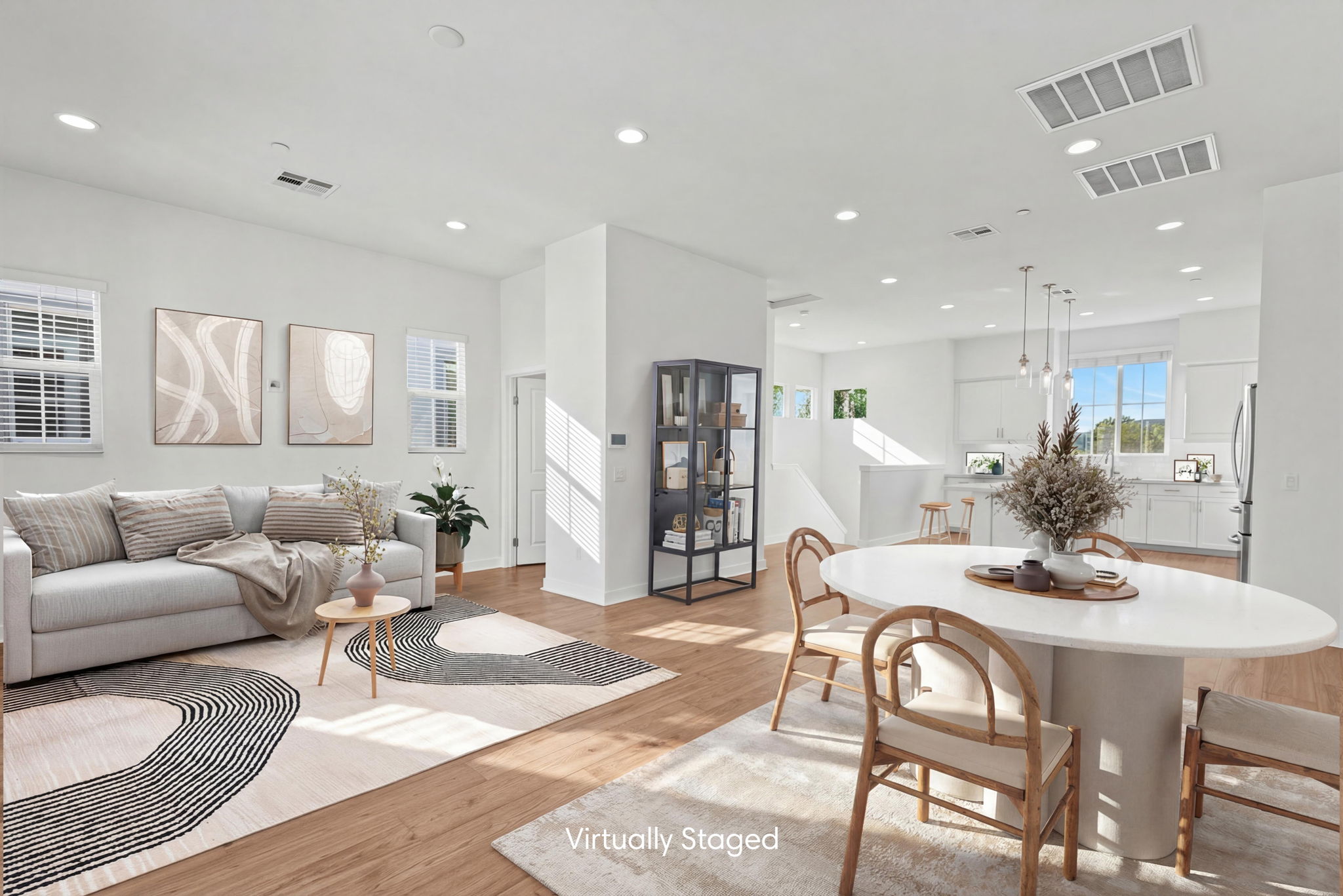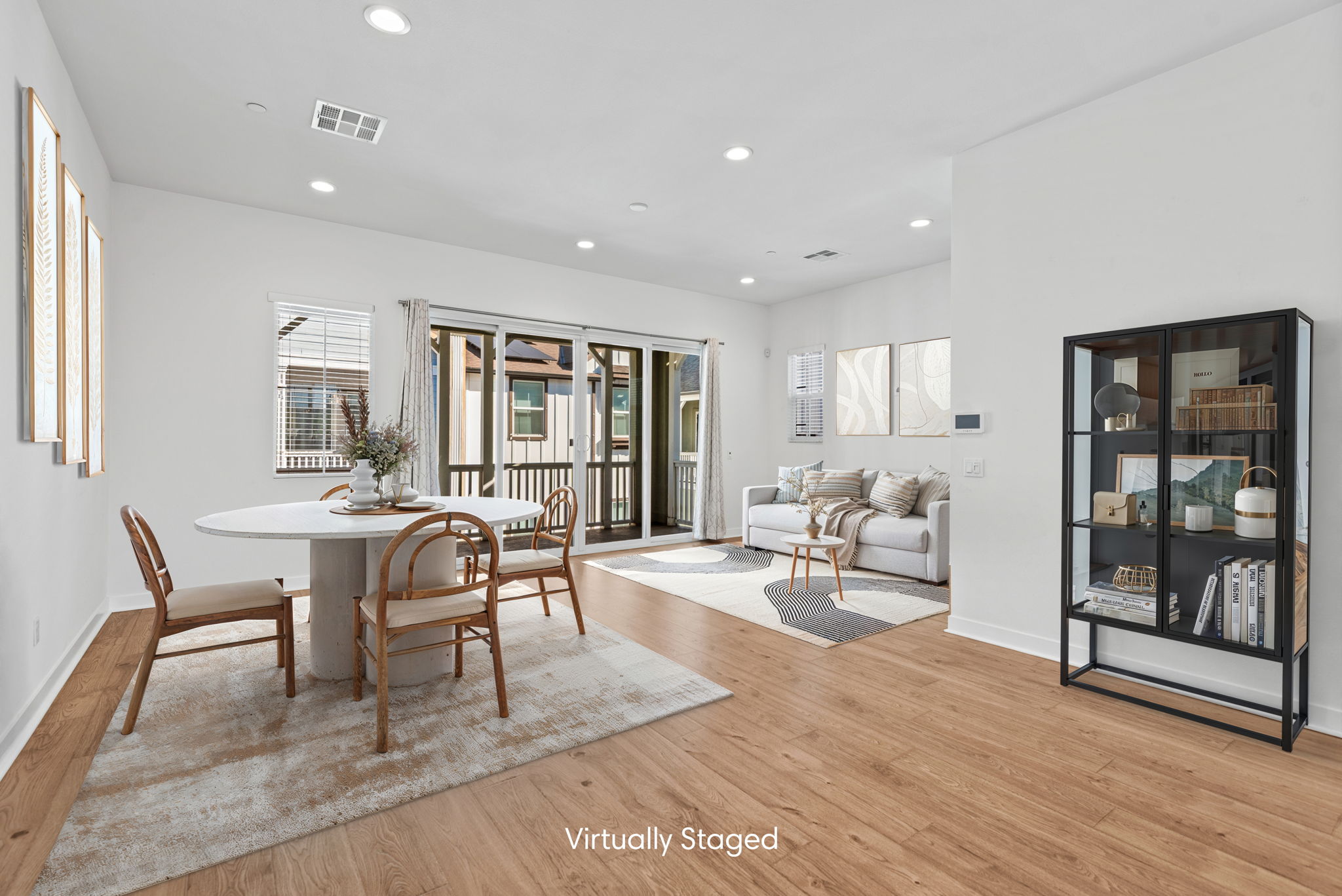 The main entry, via a private walkway, features high ceilings and natural light. The entry-level 4th bedroom suite offers privacy with an en-suite bath, walk-in closet, and side-yard access—ideal for guests, an office, or a gym. The second level houses the primary retreat with a dual-vanity en-suite and walk-in closet, two additional well-sized bedrooms served by a full dual-vanity bath with a soaking tub, and a separate laundry room with plenty of storage. The third floor is an open-concept living space with a gourmet kitchen and it features solid wood cabinets, stainless steel appliances, Quartz countertops, and a large island. Additionally a walk-in pantry, dining area, powder room, and spacious living room complete the modern floor plan. Sliding glass doors open the living room to a large, private covered patio, perfect for relaxing or BBQs. Additional features include: direct-entry 2-car garage, central air/heat, dual pane windows, paid-off solar panels, tankless water heater, and ceiling fans.