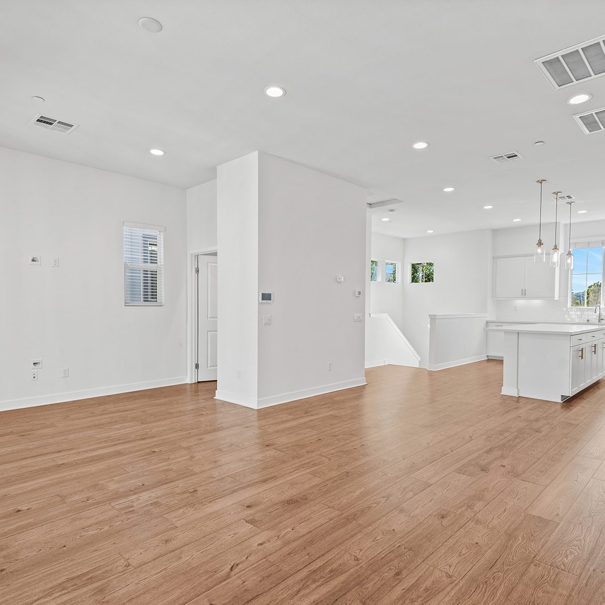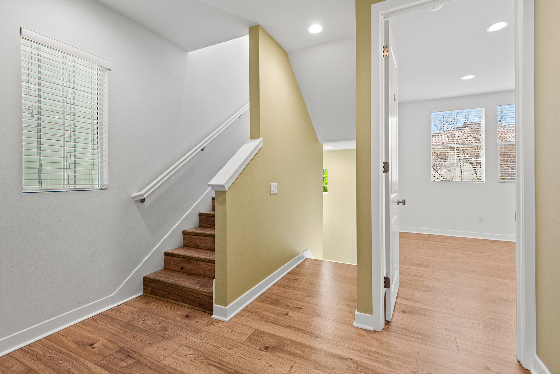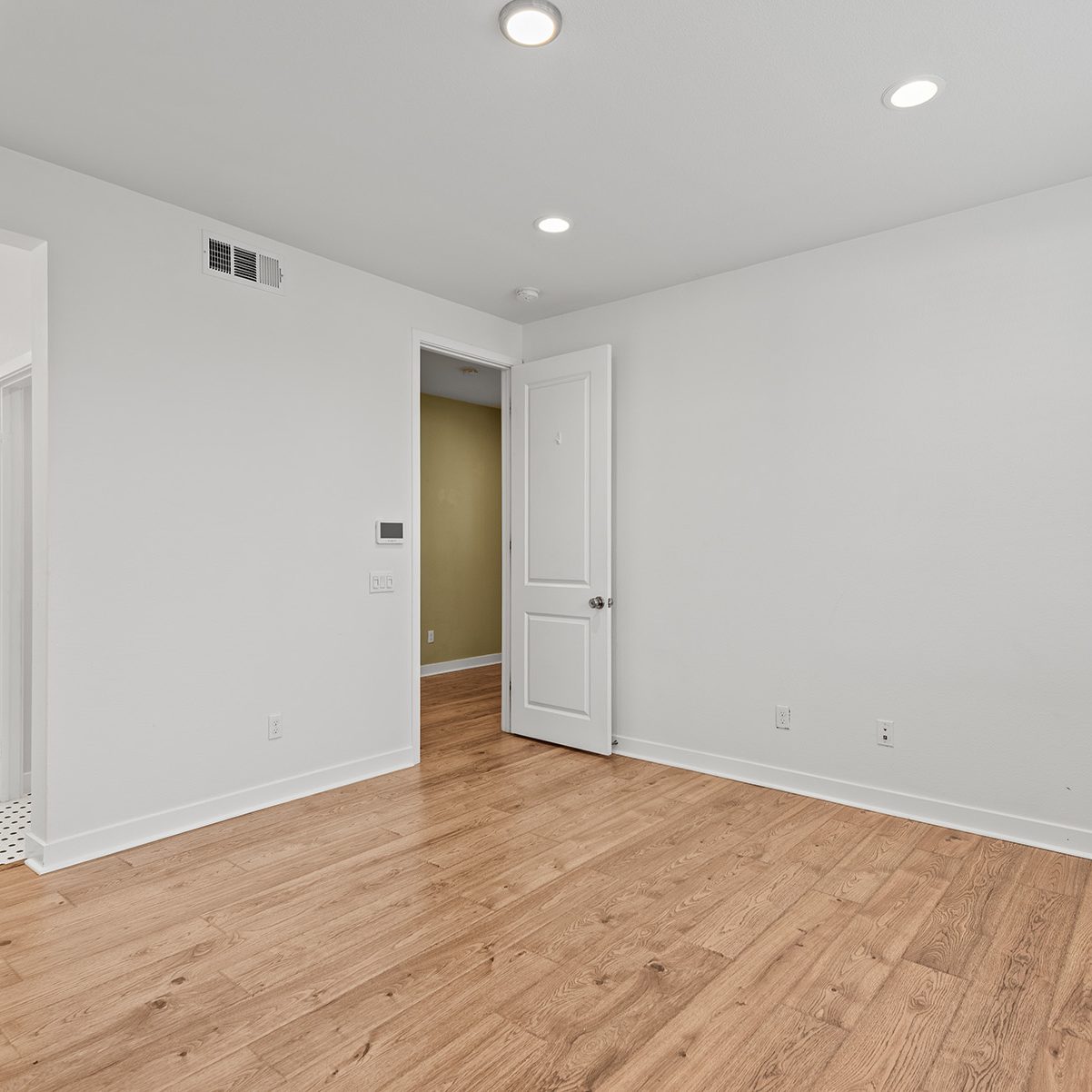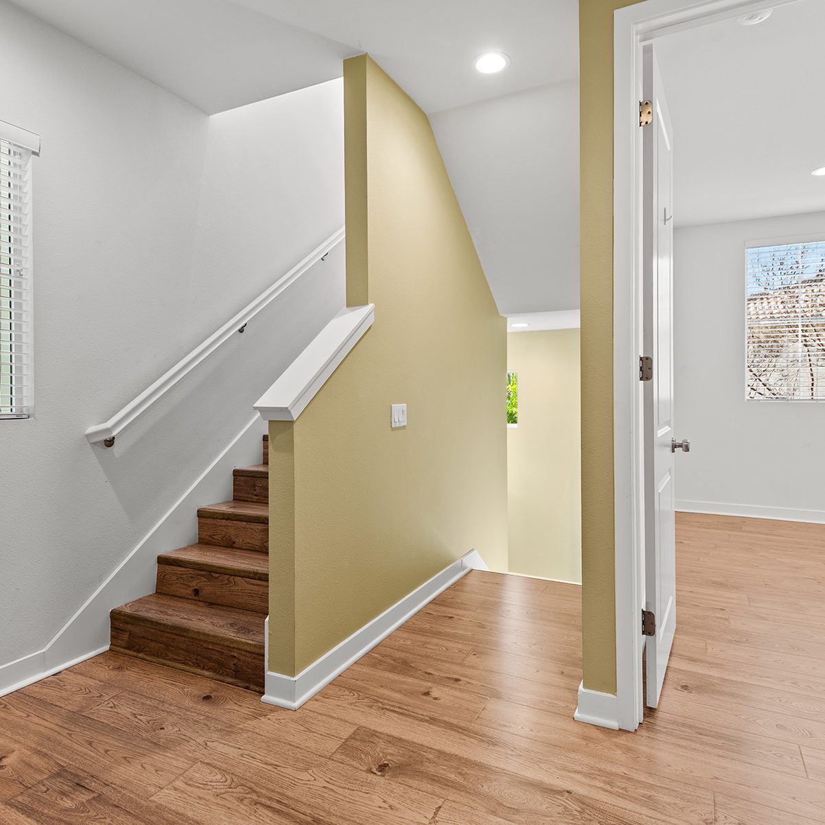 The main entry, via a private walkway, features high ceilings and natural light. The entry-level 4th bedroom suite offers privacy with an en-suite bath, walk-in closet, and side-yard access—ideal for guests, an office, or a gym. The second level houses the primary retreat with a dual-vanity en-suite and walk-in closet, two additional well-sized bedrooms served by a full dual-vanity bath with a soaking tub, and a separate laundry room with plenty of storage. The third floor is an open-concept living space with a gourmet kitchen and it features solid wood cabinets, stainless steel appliances, Quartz countertops, and a large island. Additionally a walk-in pantry, dining area, powder room, and spacious living room complete the modern floor plan. Sliding glass doors open the living room to a large, private covered patio, perfect for relaxing or BBQs. Additional features include: direct-entry 2-car garage, central air/heat, dual pane windows, paid-off solar panels, tankless water heater, and ceiling fans.